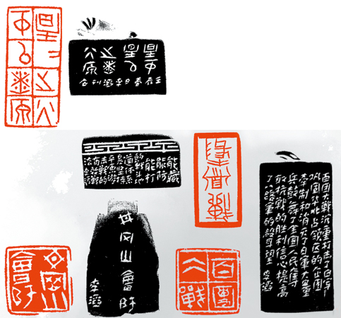 凹凸之間,黑白相和。凝眸于或奇崛、或細密、或古樸、或靈動的81方 印章,人民軍隊85載的厚重歷史徐徐展于眼前。獨具慧眼的李滔以篆刻的藝術形式切入綿延的歷史,可謂基于想象力與邏輯力的挑戰(zhàn)。他大膽突破就篆說篆的思維定勢,把軍史戰(zhàn)史如刀似斧地“殺”入篆刻領域,從而印外求印,將軍史的高深魅力寓于印文的解說,在方寸間展示篆刻神韻、展示榮光。