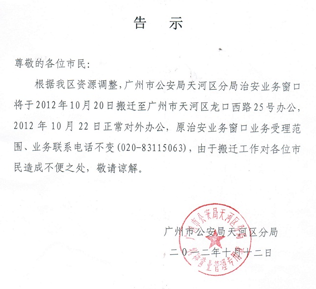 天河區(qū)公安局治安業(yè)務(wù)窗口搬遷新址告示