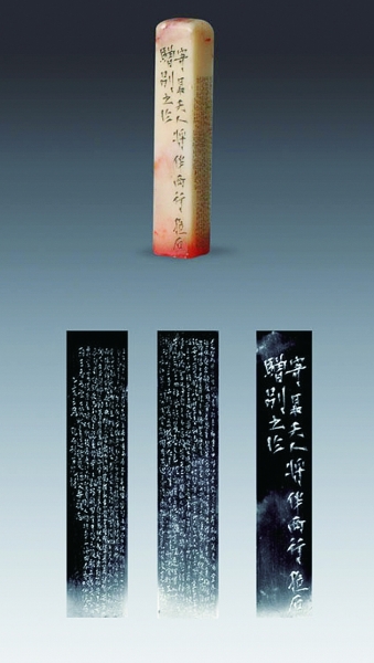 此方章為1935年日本東京傅抱石書畫篆刻作品展的原件。原印面為“一生都只為花忙”,后來傅抱石將印面磨去,改刻“劉芳”二字,贈予羅寄梅的夫人劉芳。在這方高4厘米,邊寬僅為7毫米的印章上,傅抱石用神鬼之筆刊刻了二百多字的“百花詩”,堪稱絕妙。傅抱石細(xì)字長跋的篆刻作品歷來極受學(xué)界贊譽,被認(rèn)為幾乎不可能用肉眼刊刻。1935年傅抱石在日本舉辦書畫篆刻作品展時,被日本學(xué)術(shù)界稱作“精神雕刻”,橫山大觀贊譽他“中國的雕刻大師壓倒了日本的‘粒米能手’”。據(jù)傅抱石自己說,刻這方印章時是不用肉眼看的,完全憑感覺一氣呵成。從年款來看,百花詩就刻于乙亥年(1935)。有關(guān)資料記載,在傅抱石的篆刻生涯中,微刻邊款的印章一共有九件,如今一件藏于江西省博物館,為館藏一級文物,四件藏于南京博物院,為傅抱石家屬捐獻,其余四件均已流散。傅抱石的微刻邊款妙在用刀,有筆鋒的韻味,因此傅抱石微刻邊款在篆刻界仍保持著獨一無二的首創(chuàng)性。此微雕方章在今年的嘉德秋拍中,以281.75萬元成交。 |